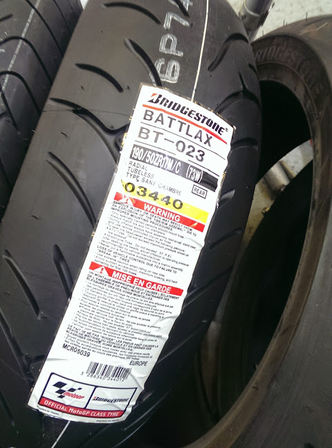 I decided to go for BT023 which are rated as a sports/touring tyre and with the dual compound should provide improved mileage. It was a toss-up really between Michelin Pilot Road 2CTs which I have had on a the last few bikes (GSX-R 1000, Fireblade and CB 1000R), the 2CTs were great but with the BT023s being a newer tyre and costing only about £10 more I opted for those – I did consider the T30s but wasn’t convinced that for the extra money I would really notice the difference.