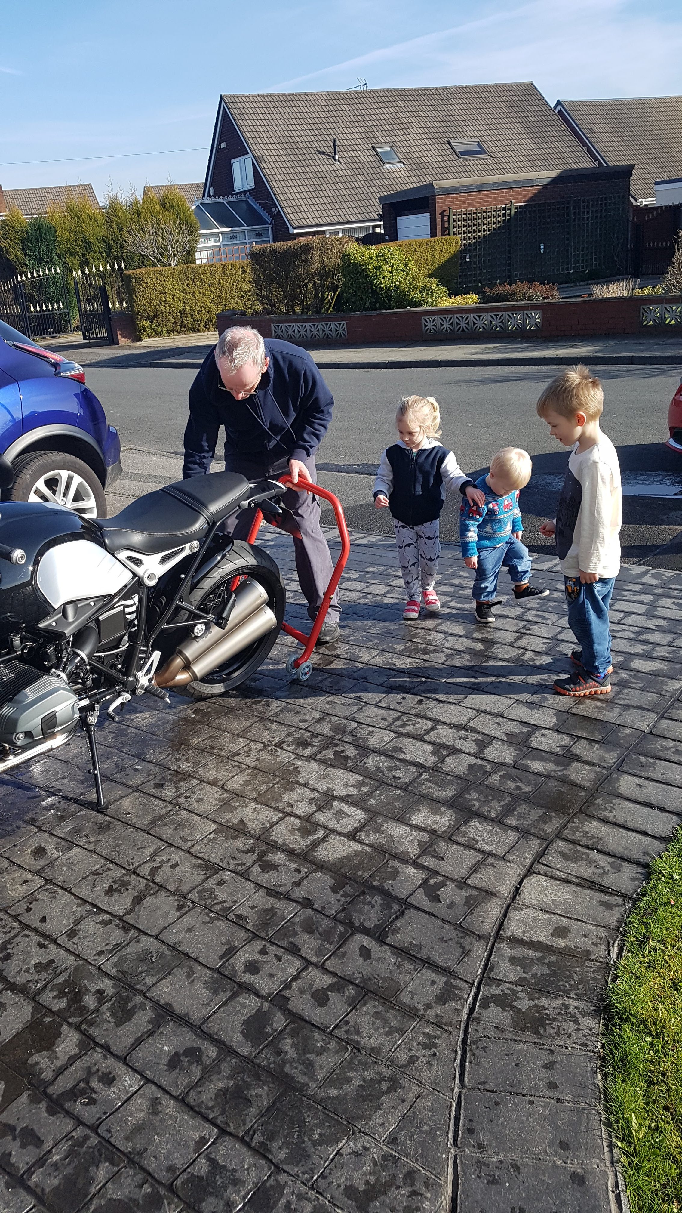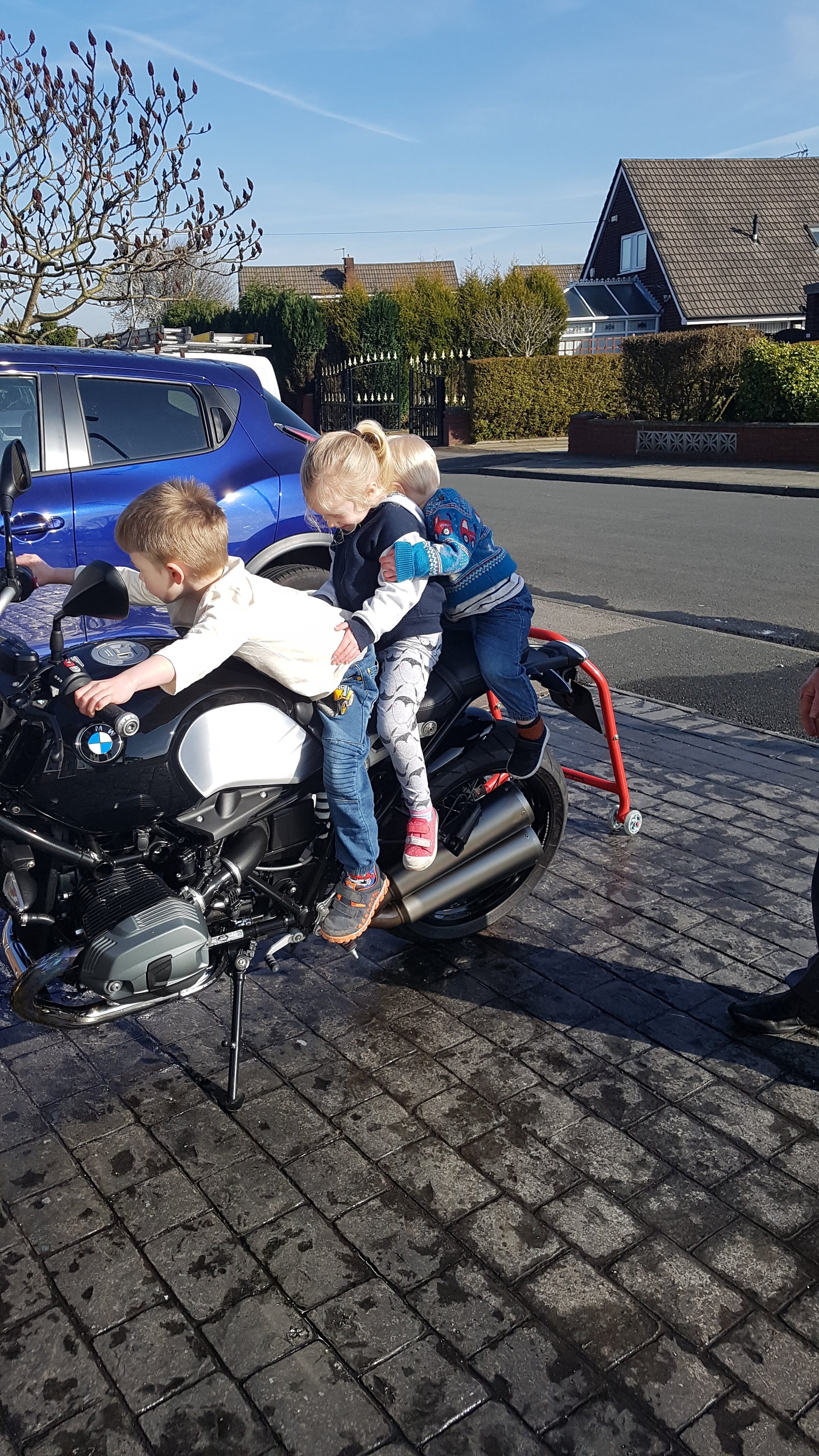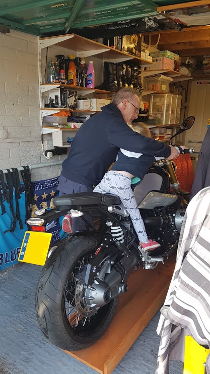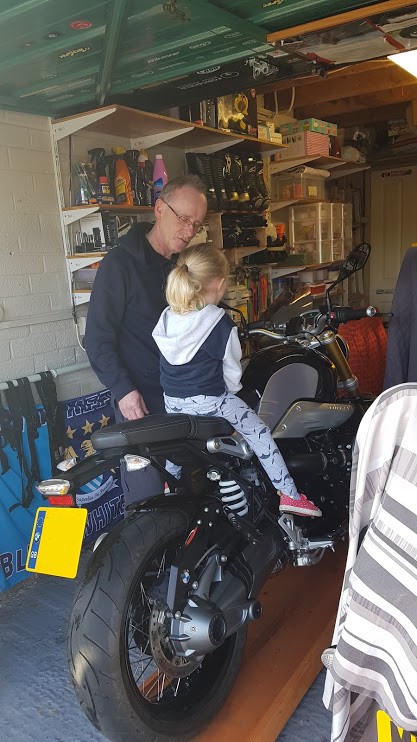 Once done they ‘assisted’ with taking the bike of the paddock stand, before demonstrating that you really can get three people on an RnineT, after that they helped push the bike in the garage … before each taking a turn to sit on it with the engine running and having a go at using the kill switch.