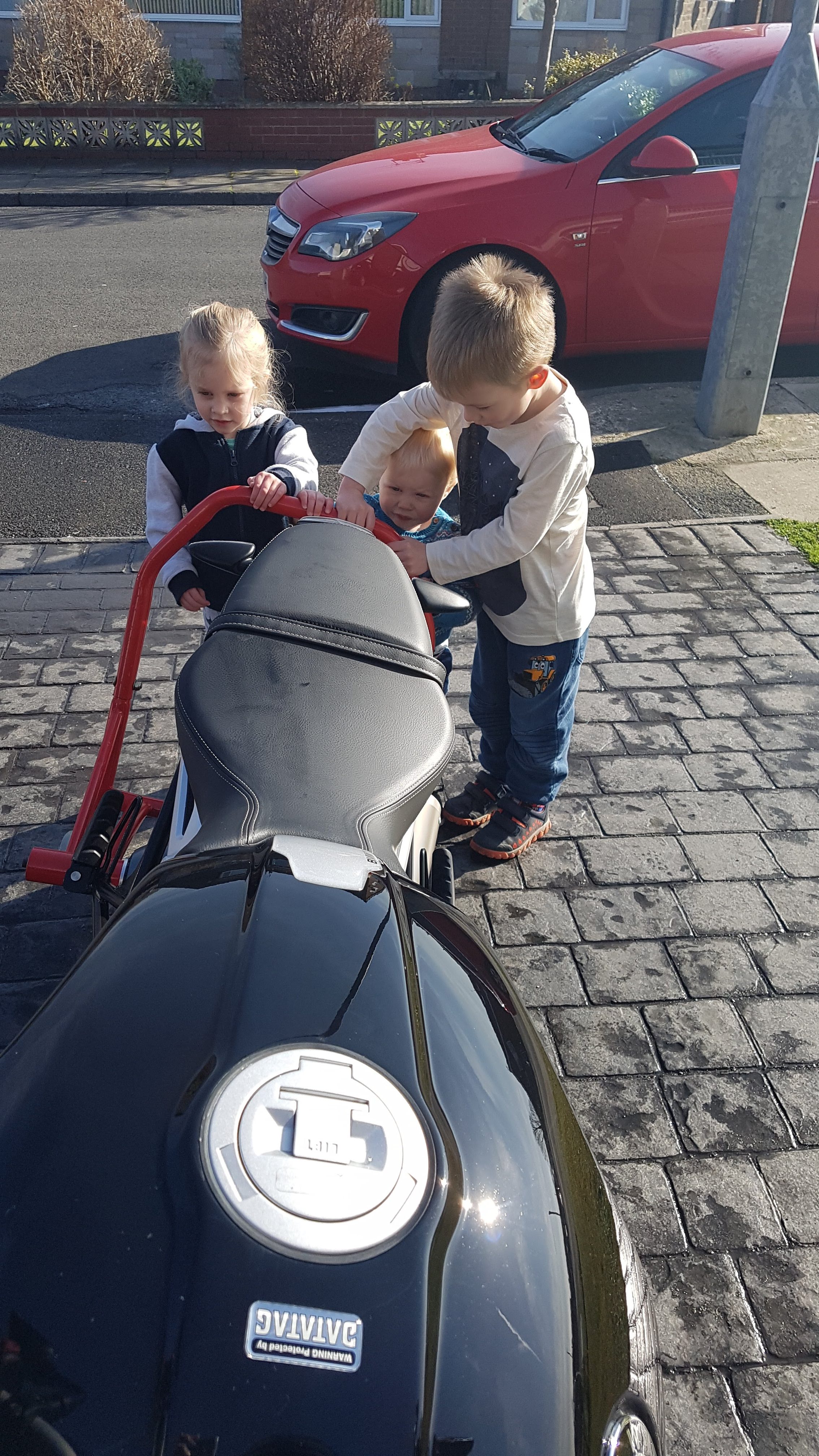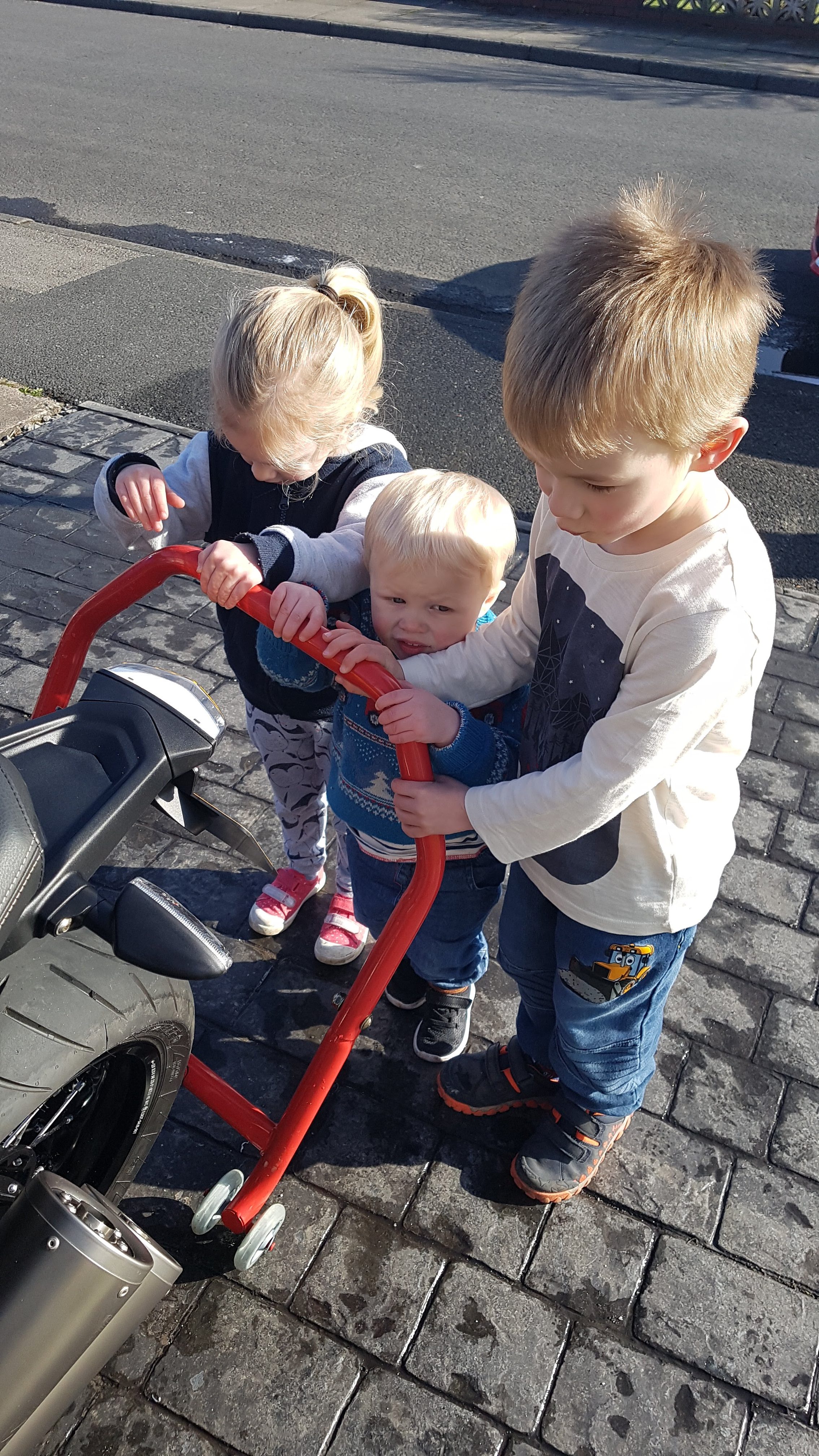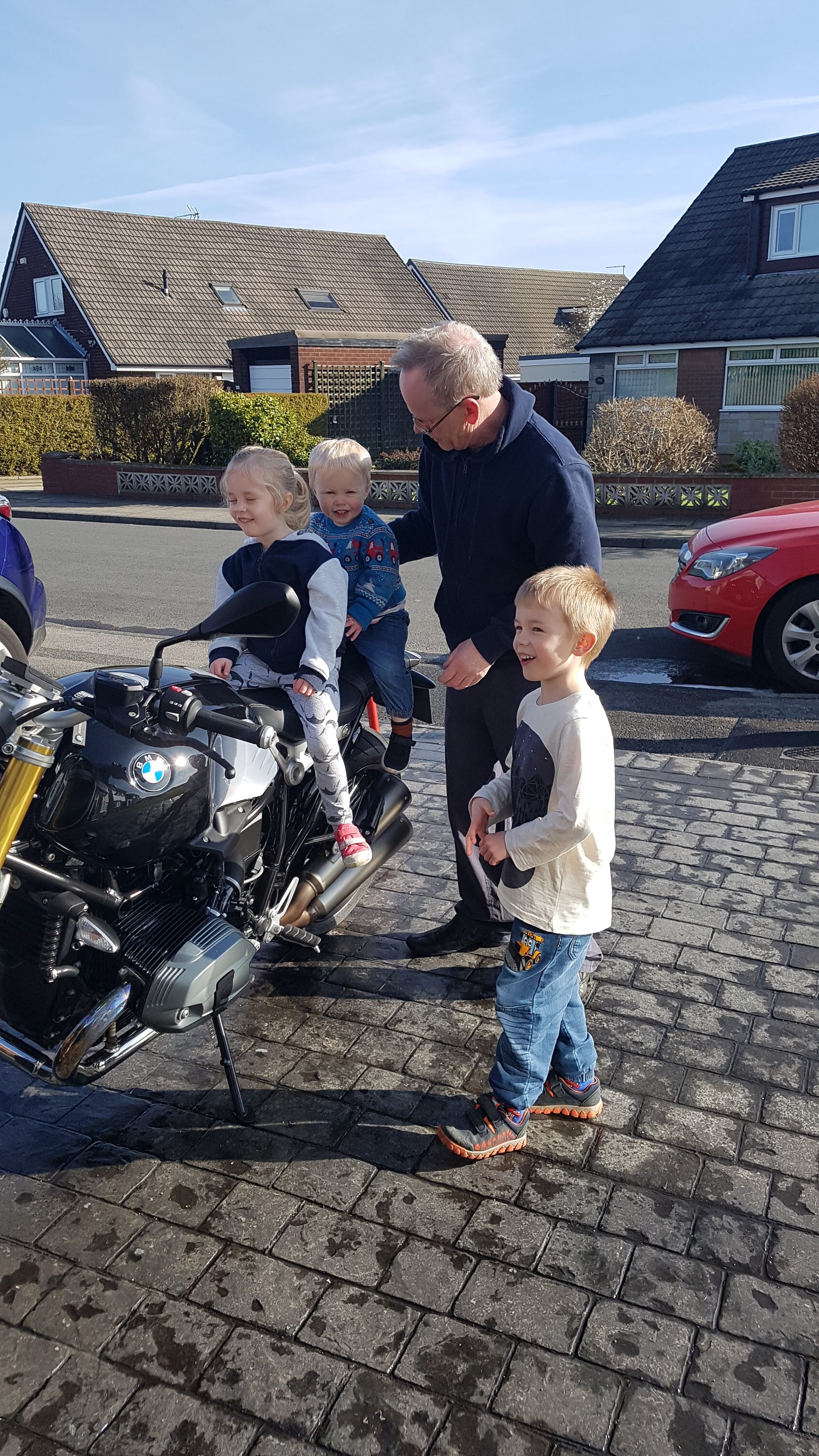 Once done they ‘assisted’ with taking the bike of the paddock stand, before demonstrating that you really can get three people on an RnineT, after that they helped push the bike in the garage … before each taking a turn to sit on it with the engine running and having a go at using the kill switch.