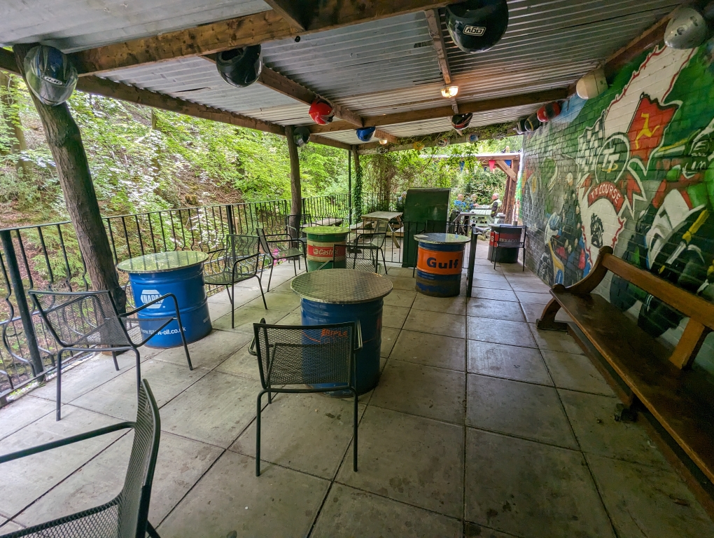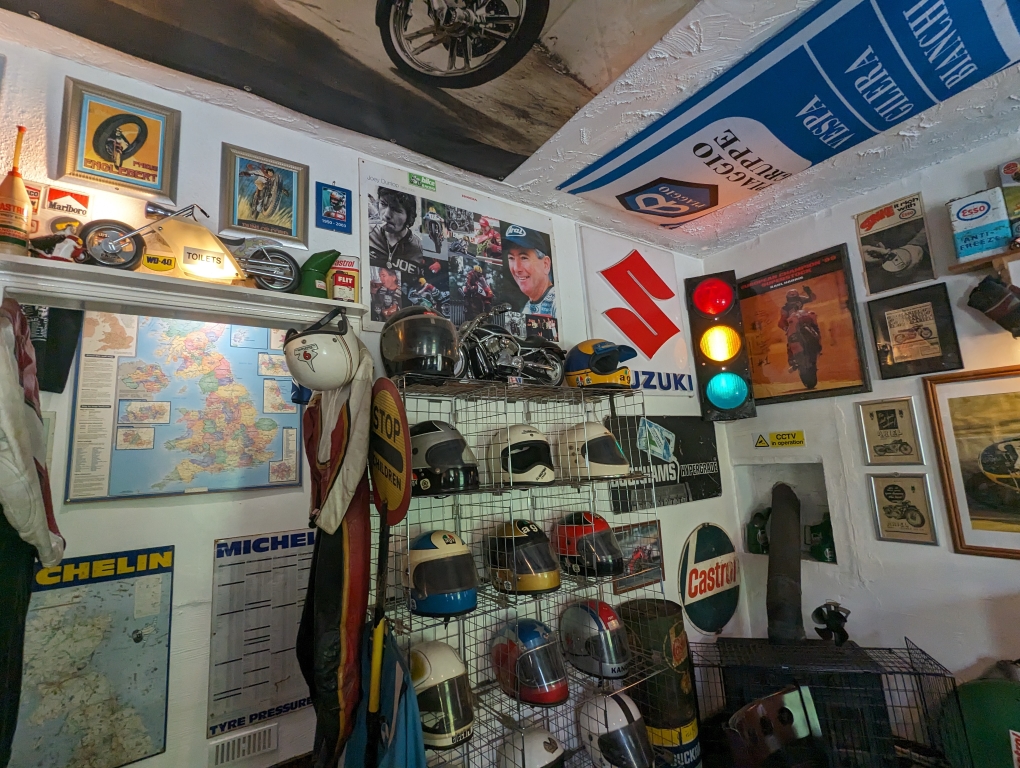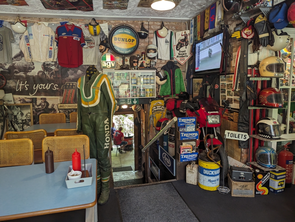 Plenty of pictures here from The Old Stores cafe in Mold. To be honest it’s almost like a visit to a museum – there is so much bike memorabilia to see. There’s a dedicated car park which is a decent size but a degree of care needs to be taken as it’s on a bit of a slope – but there are wooden off cuts for the side stands and to help leave your bike secure.