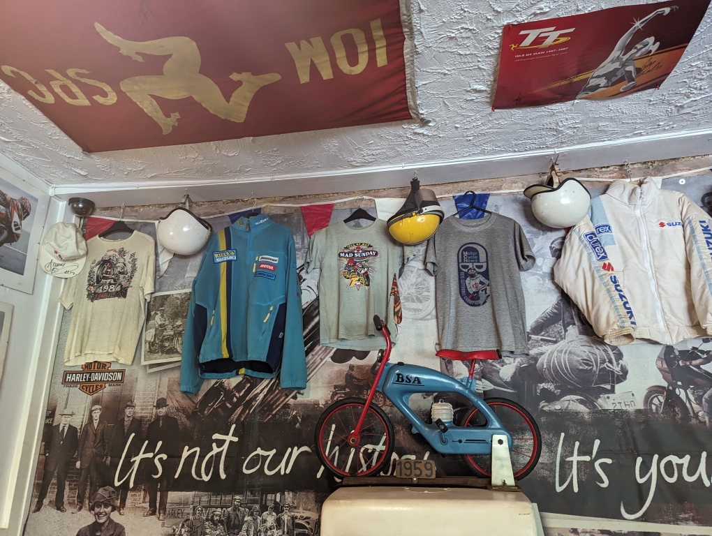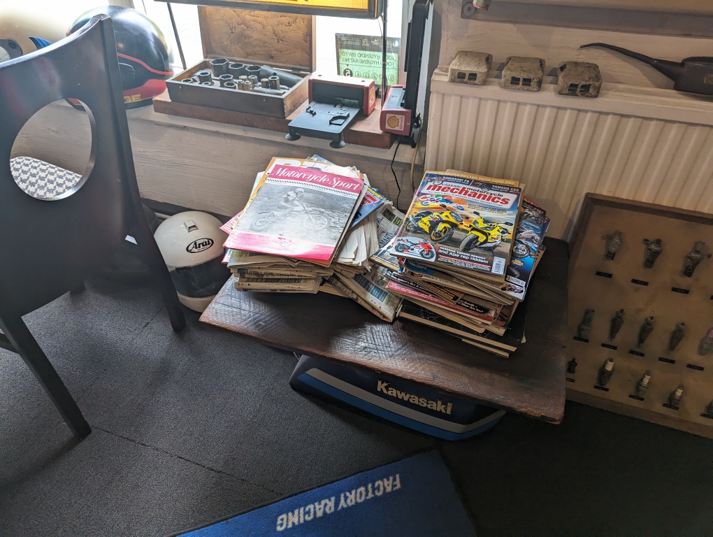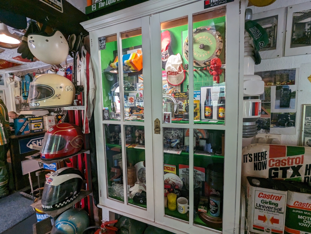 Remarkably there are even crash helmets from Barry Sheene and Kenny Roberts! There really are more vintage bits and pieces here than you can shake a stick at and items include: helmets, vintage petrol pumps, full bikes, pieces of bikes, oil cans etc.